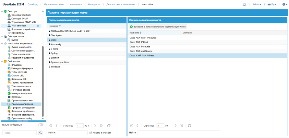 - Нормализация событий безопасности. После подключения логи сразу же проходят нормализацию – с помощью встроенных или пользовательских правил. Последние позволяют использовать регулярные выражения для тонкой настройки разбора. Пользовательские правила можно создавать в том числе на основе встроенных.