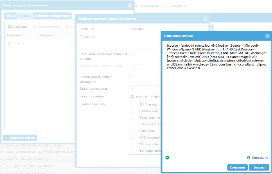 - Корреляция событий и формирование инцидентов. Собранные и нормализованные события проходят через движок корреляции, где по заранее заданным правилам выявляются потенциальные угрозы. Встроенные правила входят в подписку на экспертизу SIEM, и их можно включать выборочно. Каждое правило можно адаптировать или создать с нуля, используя SQL-подобный язык фильтрации. Аналитик может протестировать фильтр в интерфейсе, убедиться в его корректности, а затем сохранить как новое правило. Ретропоиск по уже собранным событиям позволяет мгновенно проверить его эффективность. Количество правил аналитики превышает 1000 – и это число продолжает расти.