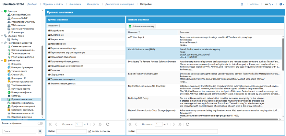 | Модуль «Подписка на экспертизу SIEM» | Получение экспертизы UserGate:обновления библиотеки правил аналитикиобновления библиотеки команд удаленного управления устройствами UserGate | 1 год, после истечения срока можно использовать старые библиотеки |