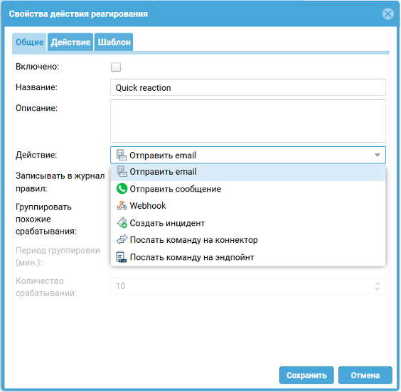 - Автоматизированное реагирование. UserGate SIEM не ограничивается обнаружением угроз. Система поддерживает автоматическое реагирование и, по сути, выполняет функции IRP/SOAR. При срабатывании правила можно задать одно или несколько действий: