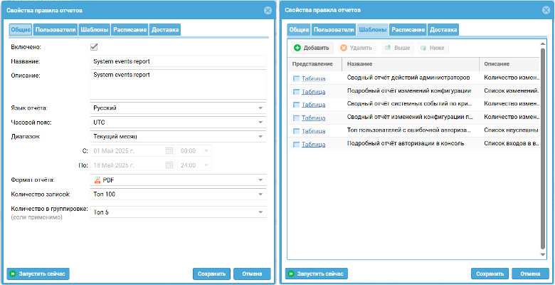 • преднастроенные шаблоные отчетов, поддержка пользовательских шаблонов;