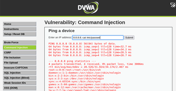 - Инъекции команд (cat /etc/passwd).