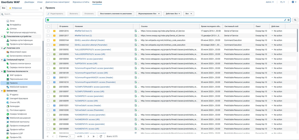 1. Анализ веб-запросов и защита от угроз L7. UserGate WAF анализирует HTTP(S)-запросы и ответы веб-серверов на них, проверяя их на соответствие встроенным и пользовательским правилам. Собственно, это функция, без которой системы не могут называться WAF. От каких же угроз можно защитить веб-приложение таким образом?