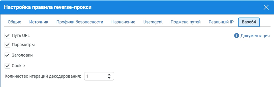 В UserGate WAF можно настроить и то, какие элементы запросов будут декодироваться из Base64 (для дальнейшего поиска паттернов атаки в декодированных строках).