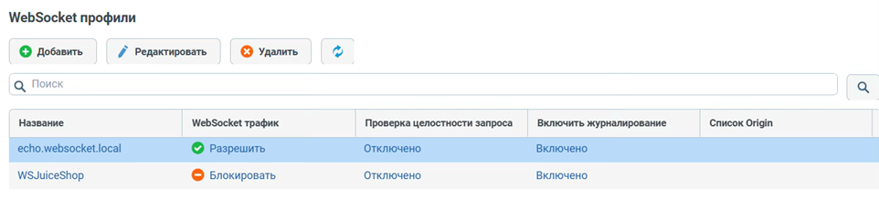 Анализируются не только HTTP(S)-пакеты – есть также возможность контролировать безопасность передачи данных по протоколу WebSocket (проверяется целостность запроса, можно включить белые списки заголовков Origin и списки разрешенных субпротоколов и расширений).