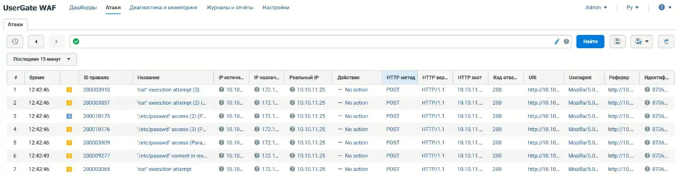 - Известные уязвимости ПО веб-сервера (функция виртуального патчинга). Правила анализа UserGate WAF содержат в том числе сигнатуры атак, эксплуатирующих известные уязвимости веб-серверов (nginx, Apache).