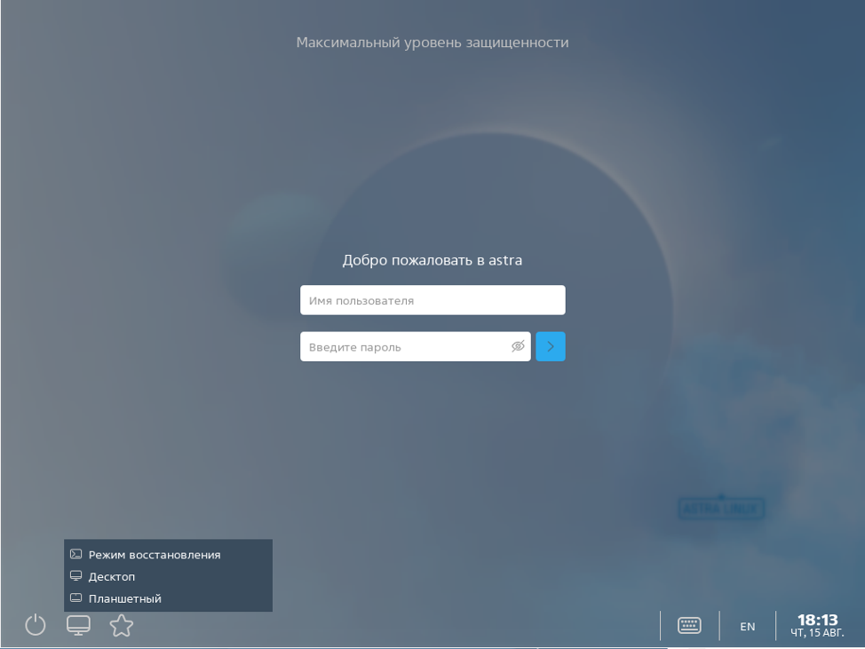 После установки и перезагрузки перед пользователем предстает окно входа в систему. Можно выбрать режим интерфейса: десктопный, предназначенный для традиционного использования на рабочих станциях, и планшетный.