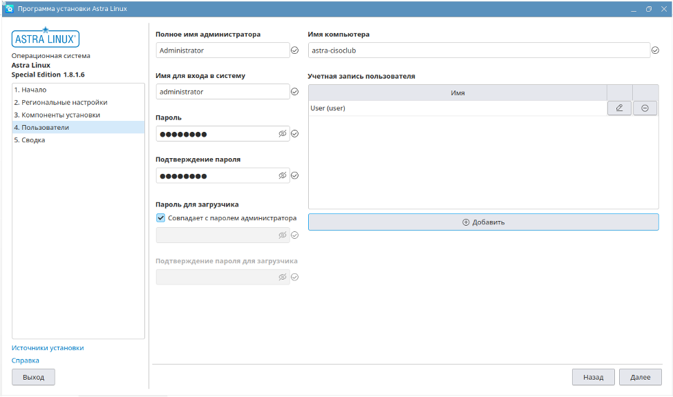 Далее создается учетная запись администратора и других пользователей.