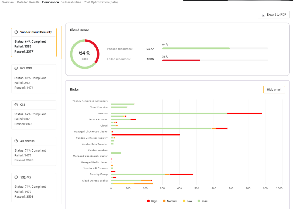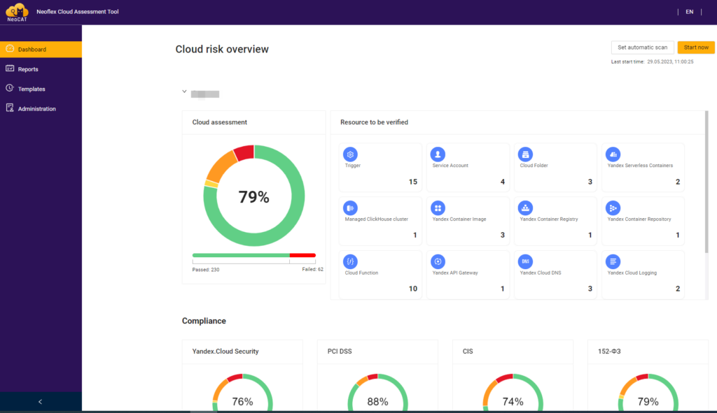 NeoCAT позволяет выявлять, приоритизировать и устранять риски безопасности в облачной инфраструктуре до их реализации злоумышленником. Инструмент показывает информацию о безопасности конфигурации облаков и ресурсов на удобочитаемых дашбордах: