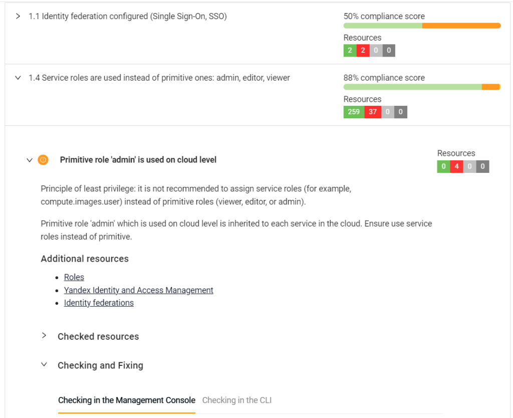 Проверка и анализ рисков безопасности производиться через Cloud API облачного провайдера. Продукт анализирует конфигурацию ресурсов и сервисов облака в соответствие с заданным правилами и условия. На текущий момент поддерживается более 400 уникальных проверок.