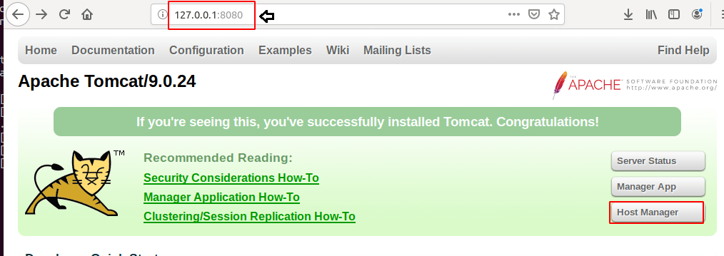 Пользователь попадает в интерфейс, введя доменное имя своего сервера или IP-адрес, а затем открывает порт 8080 в браузере. Теперь он может проверить, работают ли интерфейсы Manager и Host Manager. Нужно нажать на кнопки, выделенные красным на изображении.
