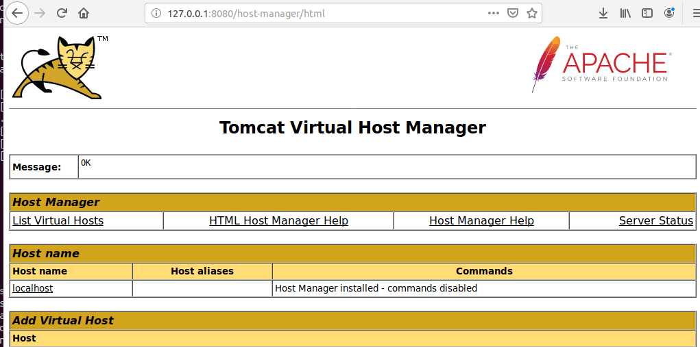 После проверки учетных данных Apache Tomcat отправляет пользователя в интерфейс диспетчера виртуальных хостов Tomcat. На этой странице человек может добавить виртуальные хосты для обслуживания своих приложений. На этом настройка Apache Tomcat завершается.