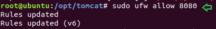 Пришло время разрешить Тomcat работать через брандмауэр, так как Ubuntu имеет установленный и настроенный по умолчанию ufw. Apache Tomcat обычно использует порт 8080 для получения запросов пользователей.