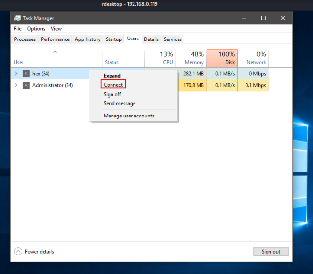 Когда хакер подключается к пользователю с именем «Администратор» и открывает Диспетчер задач, а потом переходит к пользователям, он увидит следующую картину. Пользователь с именем «hex» в настоящее время вышел из системы, но он существует.