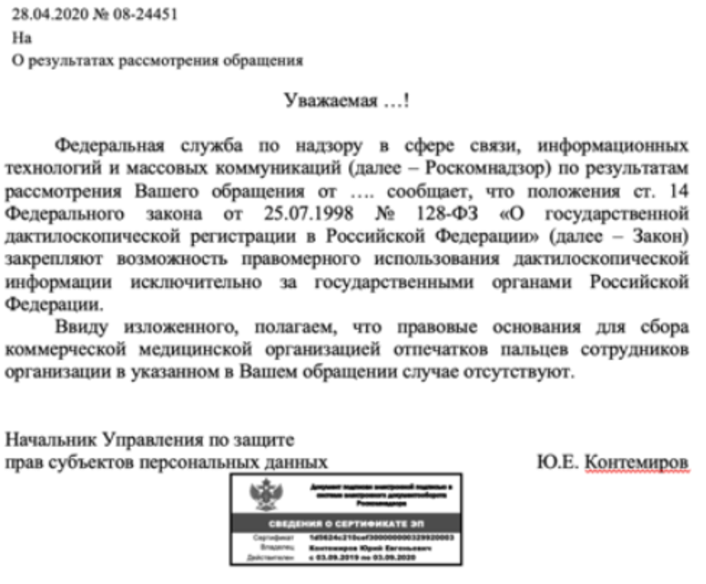 Согласно позиции Роскомнадзора, изложенной в ответе от 28 апреля 2020 г. № 08-24451, положения ст. 14 Федерального закона № 128-ФЗ закрепляют исключительное право государственных органов на проведение дактилоскопической регистрации.