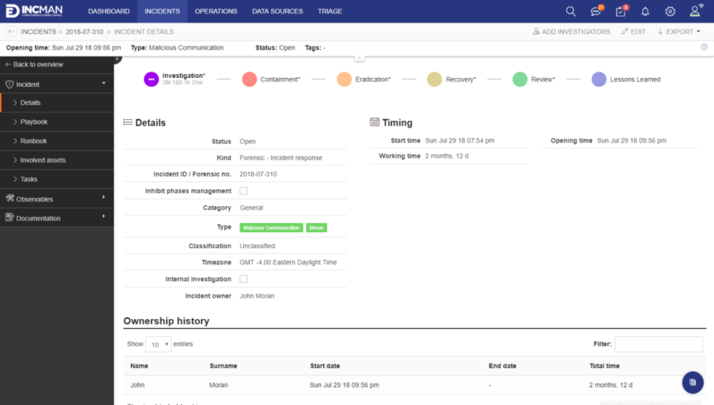 - комплексное управление инцидентами на основе использования машинного обучения и передовых технологий поиска угроз, что включает в себя управление расследованиями, ведение отчетности об инцидентах, журнал действий, корректирующие и предупреждающие действия (CAPA), аварийное восстановление данных;