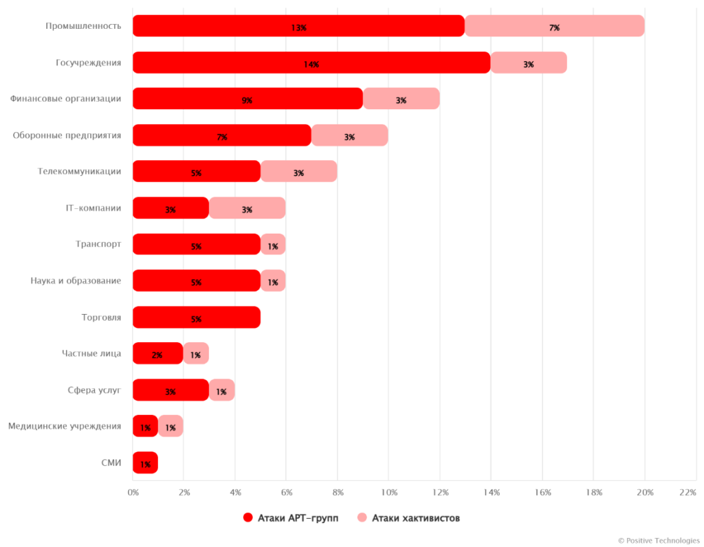 Всего в 2025 году на территории СНГ эксперты Positive Technologies отслеживали деятельность 123 киберпреступных групп, из которых 57 проявили себя в России. Активнее всего действовали Rare Werewolf, Lifting Zmiy, PhantomCore, Cyber Partisans, Silent Crow и TA558. Их главными целями стали промышленные предприятия, правительственные учреждения и финансовые организации: на эти сферы пришлось почти 50% всех атак. При этом промышленность атаковало большинство активных группировок. Последствия подобных киберпреступлений принимали разные формы: от крупных утечек конфиденциальных данных до прямого вывода из строя объектов инфраструктуры.