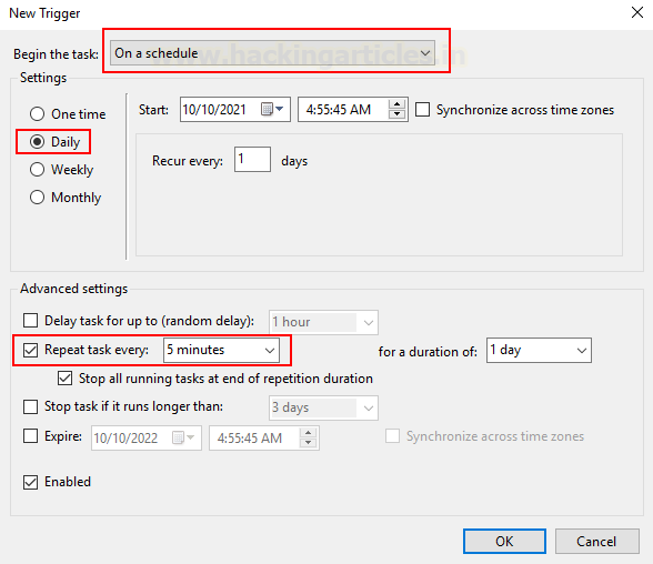 Шаг 3. Хакер выбирает условия (триггеры) для запуска запланированной задачи.
