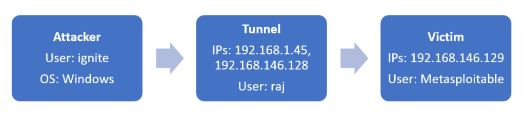 Есть три машины. Хакер связывается с машиной с двумя сетевыми картами и атакует машину, работающую в альтернативной подсети (192.168.146.0/24).