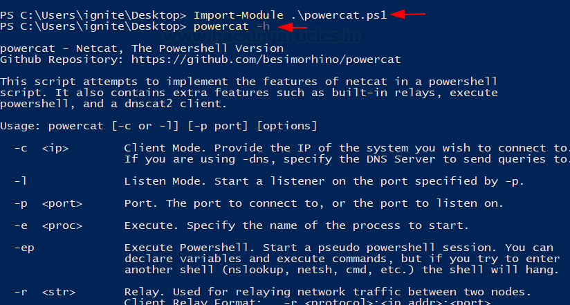 Теперь, когда пользователь загрузил скрипт Powercat, он может импортировать его в текущий терминал Powershell, а затем ввести следующую команду: