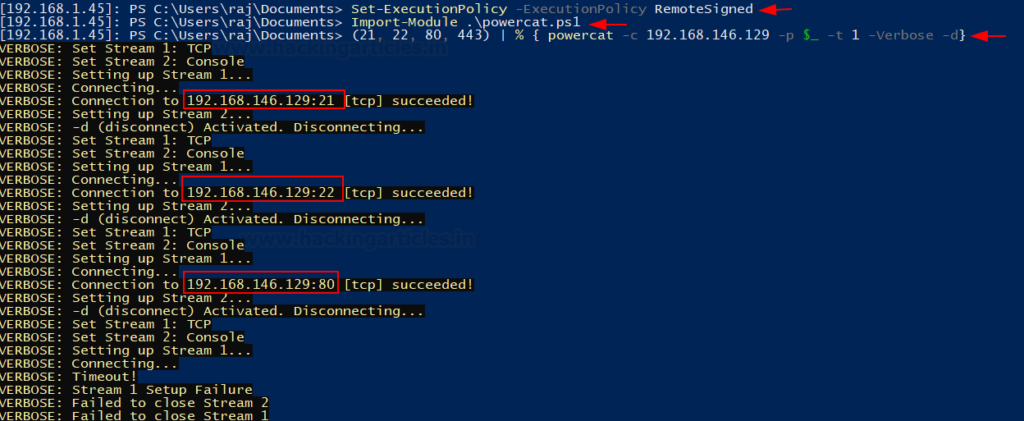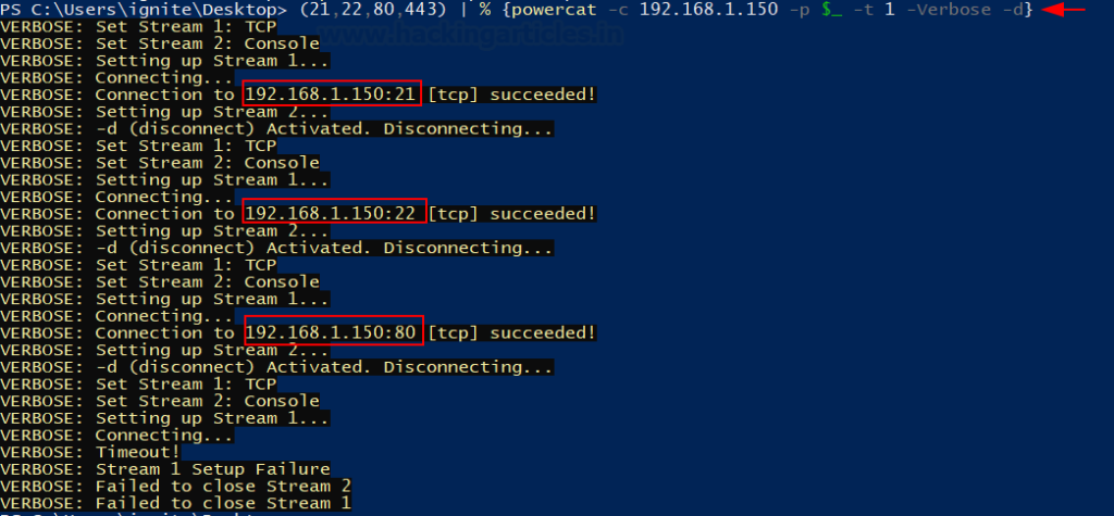 (21,22,80,443) | % {powercat -c 192.168.1.150 -p $_ -t 1 -Verbose -d}