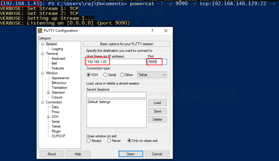 TCP-трафик с порта 22 (192.168.146.129) теперь ретранслируется 192.168.146.128 (туннель) на порту 9090. Таким образом, из внешней системы пользователь использует PuTTY для подключения к порту 9090 туннельной машины, что соединяет его с машиной жертвы.