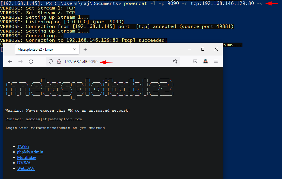 powercat -l -p 9090 -r tcp:192.168.146.129:80 -v