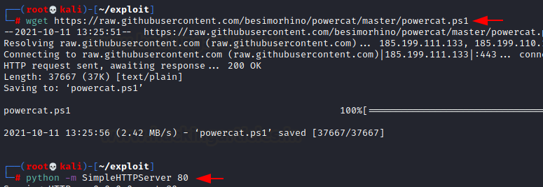 Powercat Reverse Shell также существует как однострочная команда. Предположим, что пользователю доступно выполнение кода на машине жертвы, он может использовать однострочный shell от Powercat, чтобы вернуть reverse shell на листенер, запущенный на машине хакера. Для этого процесса нужно загрузить Powercat в отдельную папку и запустить веб-сервер.