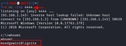 Пользователь заранее настроил листенер на атакующей машине (Kali) и ждал соединения. Как можно увидеть, shell успешно выполняется.