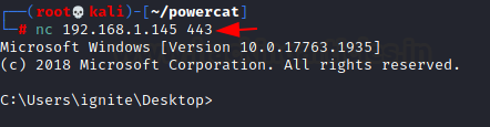 - Netcat –> Powercat. В данном случае Kali (Netcat) – это машина хакера с листенером, работающим на порту 443. Windows, работающая под управлением Powercat, должна подключиться к нему.