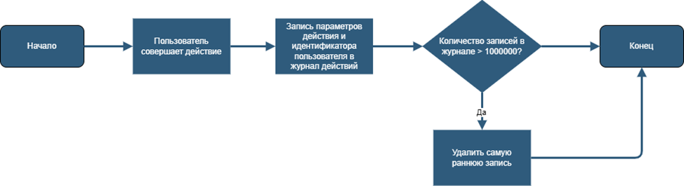В качестве примера можно рассмотреть слегка утрированную ситуацию из реальной практики. Одним из частных функциональных требований для продуктов в сфере ИБ является наличие журнала, который фиксирует каждое действие любого пользователя в системе. При этом журнал действий очень быстро заполняется с течением времени, особенно при большом количестве пользователей в системе. Для этого нужно также предусмотреть ротацию данных. Данное требование было изложено в ТЗ продукта следующим образом: «Требуется реализовать ведение журнала действий пользователей в системе, в который должно попадать любое изменение состояния любого объекта в системе. Максимальное количество записей установить равным 1000000. Если достигнуто максимальное количество записей, то новые записи должны заменять собой самые ранние записи». К данному описанию приложена следующая схема бизнес-процесса.
