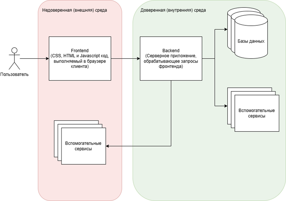 Чаще всего современные веб-приложения используют связку Single Page Application (SPA) + web API для взаимодействия с бэкендом. Логика отображения и взаимодействия с данными реализована на клиентской части (фронтенд), а для получения данных и выполнения действий над ними клиентская часть отправляет запросы к серверу по REST API или иному протоколу взаимодействия. В свою очередь бэкенд является «черным ящиком» для пользователя приложения. За границами REST API может скрываться любой стек технологий, используемых баз данных, сервисов и библиотек. Подобный подход уже делает приложение более безопасным, обеспечивая принцип Security through obscurity (безопасность через скрытие внутреннего устройства системы). Бэкенд может быть монолитным компонентом или разделен на множество микросервисов. Он может взаимодействовать с одной или несколькими базами данных, очередями сообщений и иными вспомогательными сервисами. Данные сервисы могут находиться как в одном контуре с самим сервером, так и во внешней сети. Схематично архитектуру типового веб-приложения можно представить на следующей схеме: