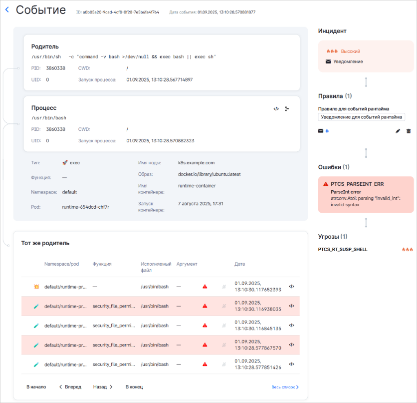 Теперь проверка события рантайма в PT Container Security продолжается даже при возникновении ошибки на одном из детекторов в цепочке. Оператор SOC может дополнительно изучить возникшие ошибки и список детекторов, через которые не удалось завершить проверку. Непрерывность анализа экономит время специалиста по ИБ, освобождая его от необходимости вручную искать причину остановки и повторно запускать проверку всеми детекторами.