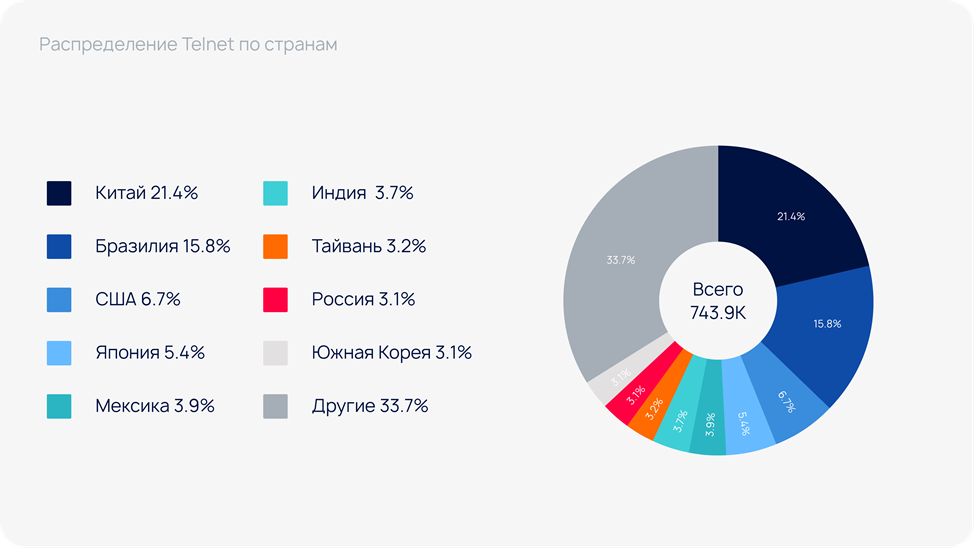 Аналогичную статистику по глобальному распространению открытого telnetd также публикует проект ShadowServer.