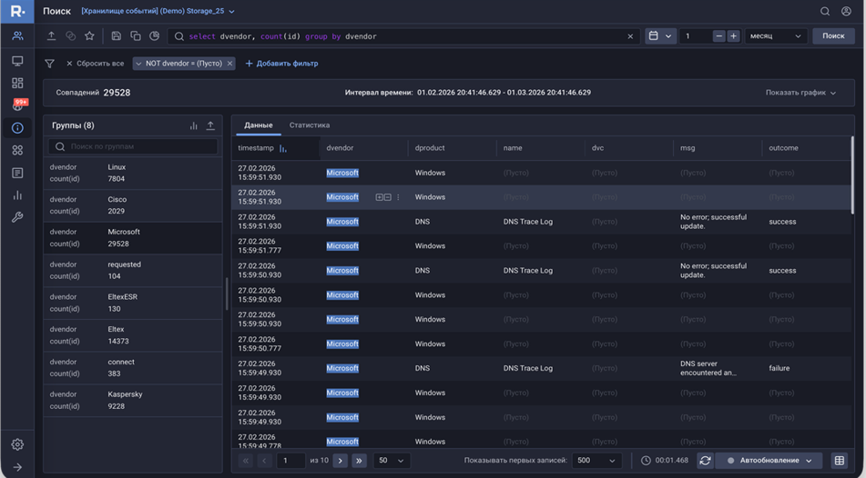 Появилась возможность выполнять поиск одновременно по нескольким хранилищам из нескольких баз, что ускоряет анализ в распределённых инсталляциях и сокращает время подготовки отчётности.