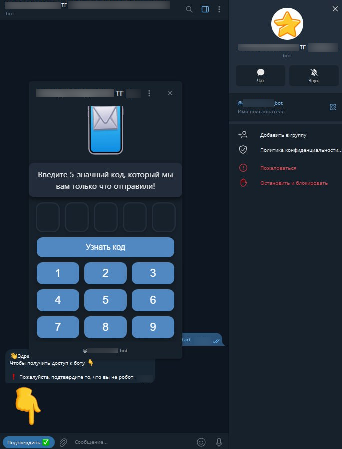 Специалисты департамента защиты от цифровых рисков (Digital Risk Protection) компании F6 обнаружили в Telegram бота, который обещает обойти замедление мессенджера. Чтобы получить доступ к боту, от пользователя требуют подтвердить, что он «не робот». При нажатии кнопки «Подтвердить» пользователь фактически даёт согласие на передачу боту данных о своём номере. Затем под предлогом проверки пользователя просят ввести 5-значный код, который якобы отправил бот. На самом деле это – код авторизации Telegram. Если ввести его в форму бота «обхода замедления», то злоумышленники моментально получат доступ к аккаунту, если в аккаунте не включен «облачный пароль».