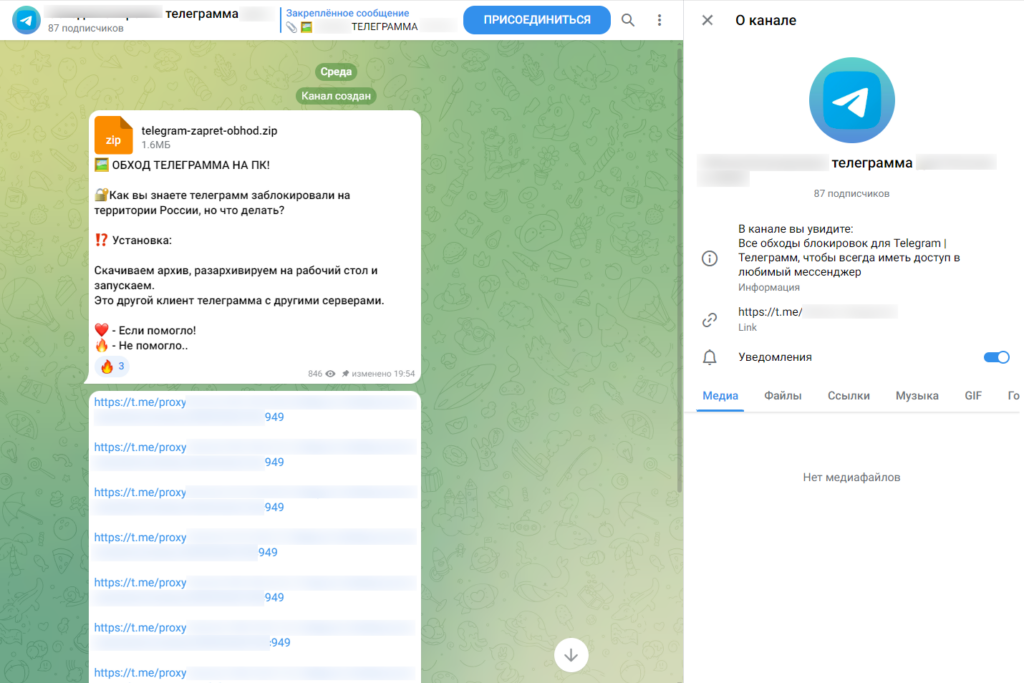 Кроме того, в Telegram после замедления в России появляются новые каналы с названиями, которые связаны с тематикой обхода блокировки мессенджера. В частности, эти каналы предлагают скачать и установить на компьютер «клиент телеграмма с другими сервисами» (орфография оригинала сохранена), а также перейти по ссылкам, которые якобы позволят обойти блокировку. Аналитики F6 проверили файловый архив, обнаруженный в одном из таких каналов: это оказался троян – вредоносное приложение для Windows.