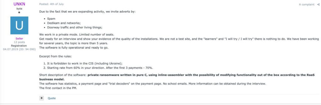 За счет применения модели RaaS операторы вредоносного ПО обычно получают 30-40% от размера выкупа, остальное забирают партнеры. Практически все доступные сегодня модели RaaS рассчитаны только на опытных и квалифицированных хакеров. К примеру, группировка REvil требует, чтобы каждый потенциальный партнер проходил собеседование и отправлял им «резюме»: