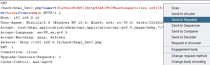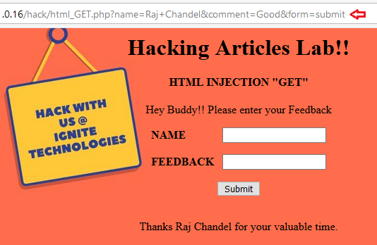 На приведенном выше изображении можно увидеть, что текущий URL-адрес отображается на веб-странице как «http: //192.168.0.16/hack/html_URL.РНР». Так что следует воспользоваться этим преимуществом и посмотреть, что пользователь сможет захватить.