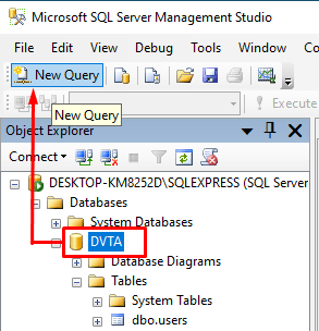 Теперь нужно будет создать несколько пользовательских таблиц и вставить в них данные, необходимые для работы приложения DVTA. Для этого человек нажмет на DVTA и выберет «Создать новый запрос» (англ. «New Query»).