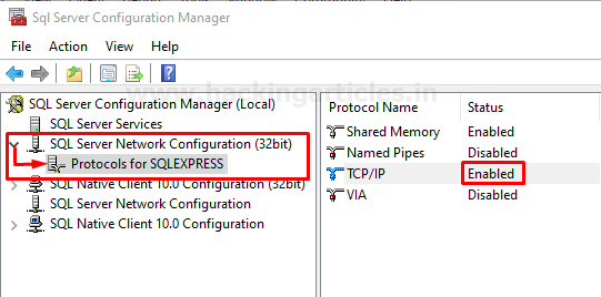Теперь остался последний шаг, после чего пользователь сможет перейти к установке сервера FileZilla. Человек открывает «Диспетчер конфигурации SQL Server», выполнив его поиск в меню Пуск. Там он находит раздел «Конфигурация сети SQL Server» и нажимает на кнопку «Протоколы для SQLEXPRESS», чтобы активировать протокол TCP/IP.