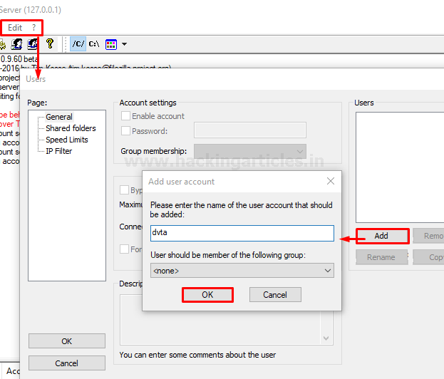 Теперь остается еще один шаг для завершения настройки сервера. Пользователь перейдет к общим папкам, нажмет на кнопку «Добавить» и выберет каталог, который будет использоваться сервером FileZilla для размещения загруженных файлов. Далее, он предоставит ему разрешения на чтение и запись файлов и, наконец, нажмет на кнопку «ОК».