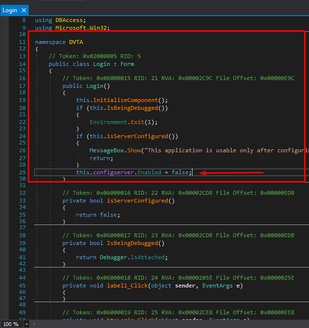 В левом боковом меню пользователь нажимает на DVTA и разворачивает DVTA.exe. Как только файл откроется, он выбирает DVTA. Теперь, пользователь находит файлы C Sharp в исходном коде. Если читатели заметили ранее, когда человек открывает приложение DVTA, оно показывает ему страницу входа в систему. На этой странице в нижней части есть кнопка «Настроить сервер». Именно она и интересует пользователя.