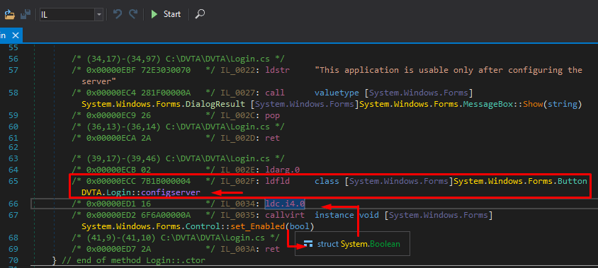 Как уже было отмечено ранее, «config server» — это кнопка, которая легко вычисляется пользователем. Она идет после этой («class [system.windows.Forms]System.Windows.Forms.Button») конкретной строки. Есть также вызов «System.Windows.Forms.Control». Метод «Set_Enabled» принимает логическое значение, которое может быть истинным (TRUE) или ложным (FALSE). Если пользователь видит, что есть значение ldc.i4.0, а затем, он наведет курсор мыши на «Set_Enabled(bool)», это поместит целочисленное значение 0 в стек оценки как int 32. Вероятно, именно по этой причине кнопка отключена – значение помещается под стек в качестве аргумента, а «Set_Enabled» всегда имеет значение «False».